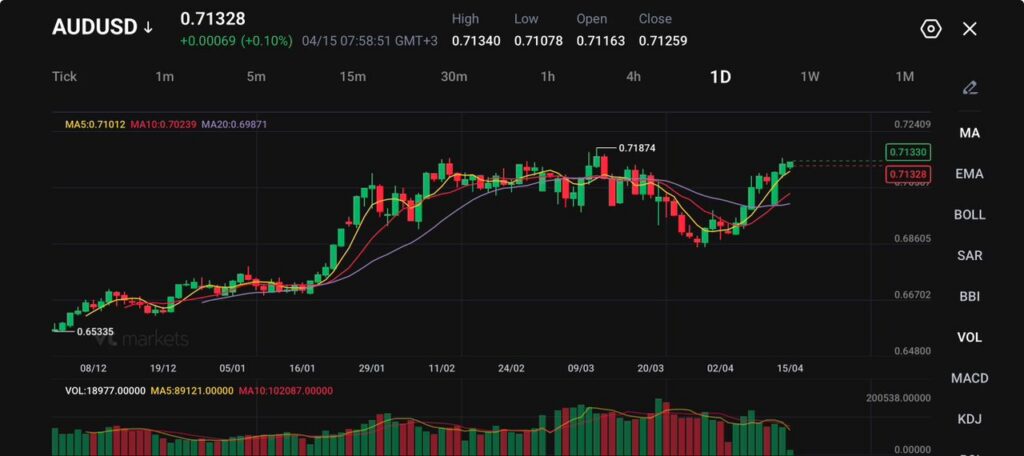 - AUDUSD торгуется на уровне 0.71328, рост 0.00069 (+0.10%), после касания 0.71340 и продолжения движения от недавнего максимума за месяц. AUDUSD — это валютная пара «австралийский доллар / доллар США».