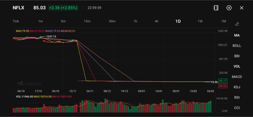 Netflix (NFLX) торгуется около 85.03, рост примерно на 2.9% за день. Но дневной график показывает крупную историческую корректировку цены или искажение данных: раньше цена отображалась около 1,247, а затем «вертикально» упала к текущему диапазону.