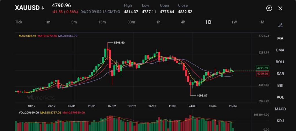 - XAUUSD торгуется на 4 790,96, снижение на 41,56 (-0,86%), после роста до 4 814,37 и падения до 4 737,11.
