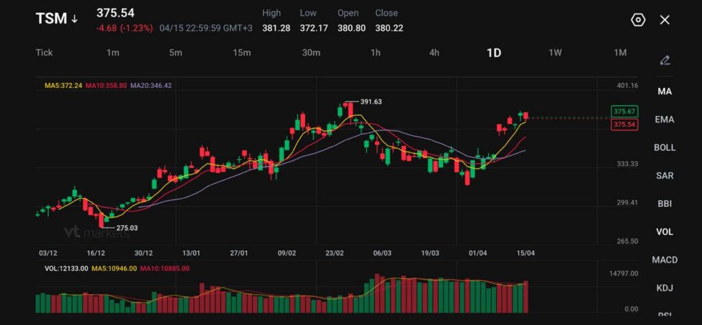 - Акции TSM торгуются по 375,54, снизившись на 4,68 (-1,23%) после роста до 381,28; цена всё ещё выше важных краткосрочных скользящих средних (это линии на графике, которые показывают среднюю цену за несколько дней и помогают понять направление движения).