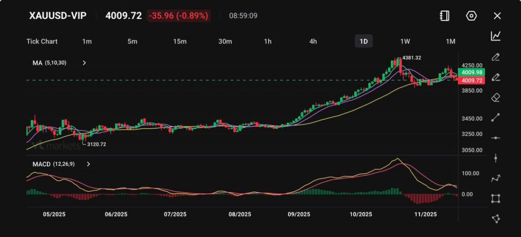 XAU/USD trades near $4,009.72, down 0.89%, marking its lowest level in over a week. The daily chart shows gold testing key support near $4,000, with the short-term moving averages (5, 10, 30) turning lower, a sign of fading momentum.