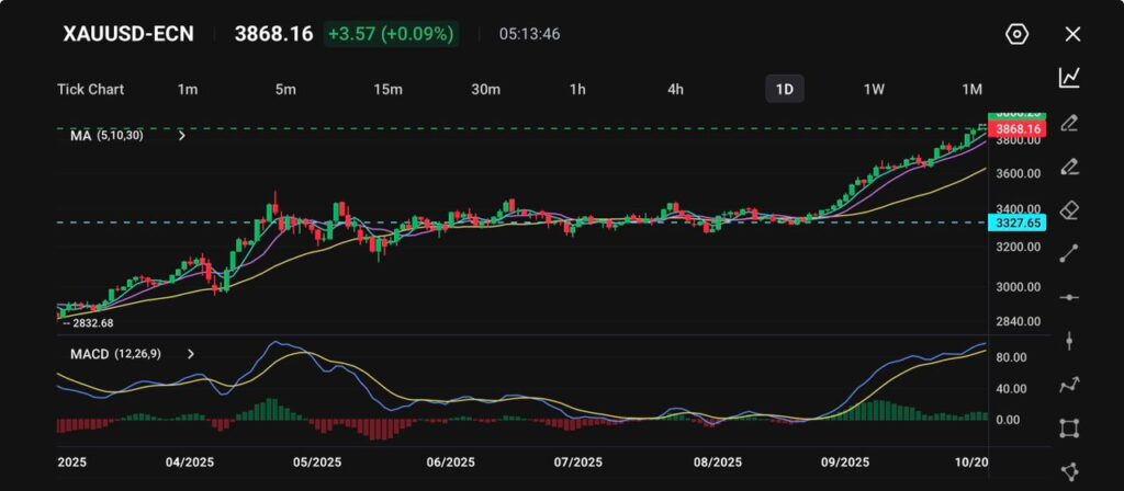 Gold (XAUUSD) is holding firm near record highs, trading at 3868.16, up 0.09% on the day. The metal continues its strong bullish momentum, extending the impressive rally that began in late August, driven by persistent safe-haven demand, softer U.S. yields, and renewed geopolitical uncertainty.