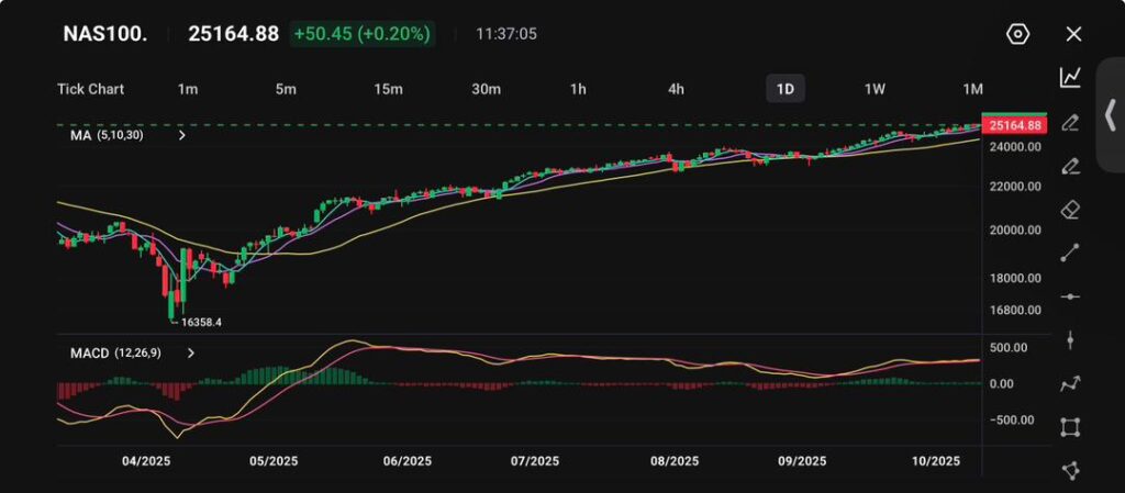 From a technical perspective, NAS100 maintains a strong bullish structure. The index is comfortably trading above its 5-, 10-, and 30-day moving averages, reflecting healthy trend alignment across short- and medium-term indicators.