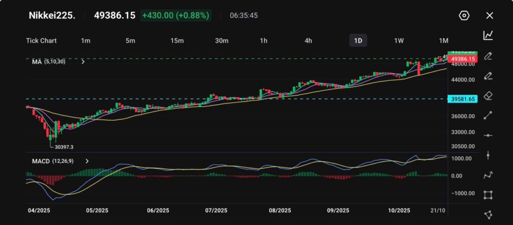 From a technical perspective, the uptrend remains firmly intact. The 5-, 10-, and 30-day moving averages continue to slope upward, confirming sustained bullish momentum since the breakout above 45,000 in mid-September.