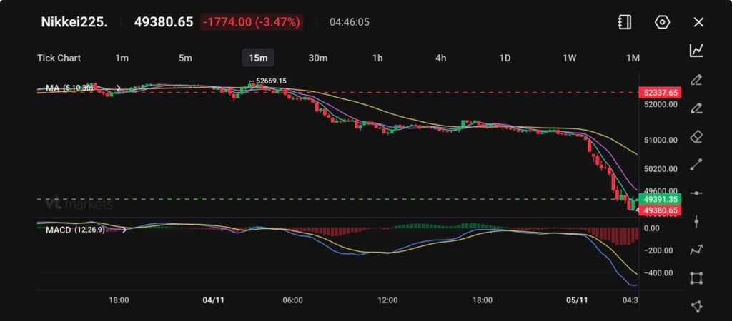 The Nikkei 225 plunged about 3.5 % to 49,380.65, erasing a portion of its recent gains and falling back below the psychological 50,000 mark. The sharp move comes after a sustained rally and now raises red flags for the short-term trend.