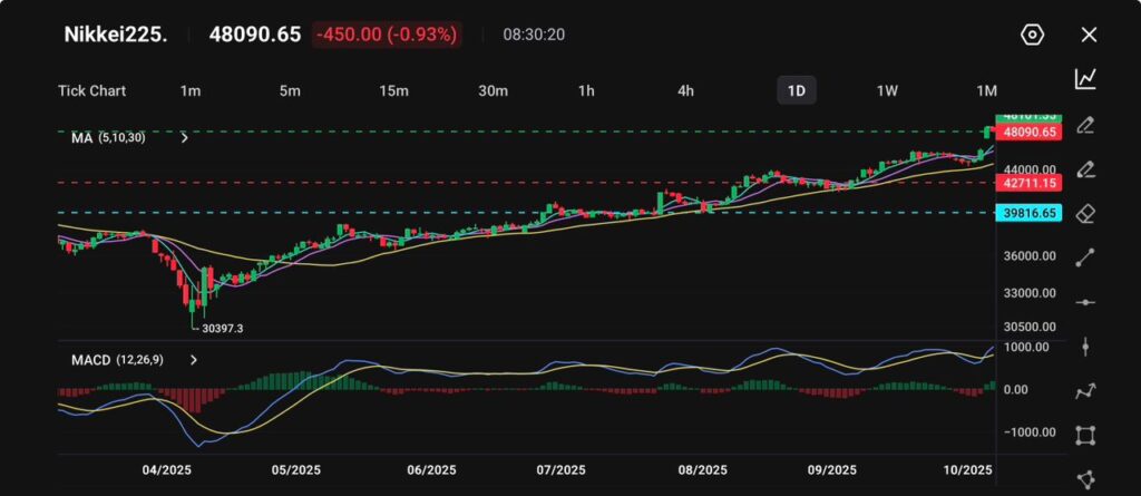 The Nikkei 225 is trading at 48,090.65, down 0.93% on the day, retreating after a strong multi-week rally. Despite today’s correction, the index remains firmly within an uptrend, having surged nearly 60% since the April low of 30,397.3.