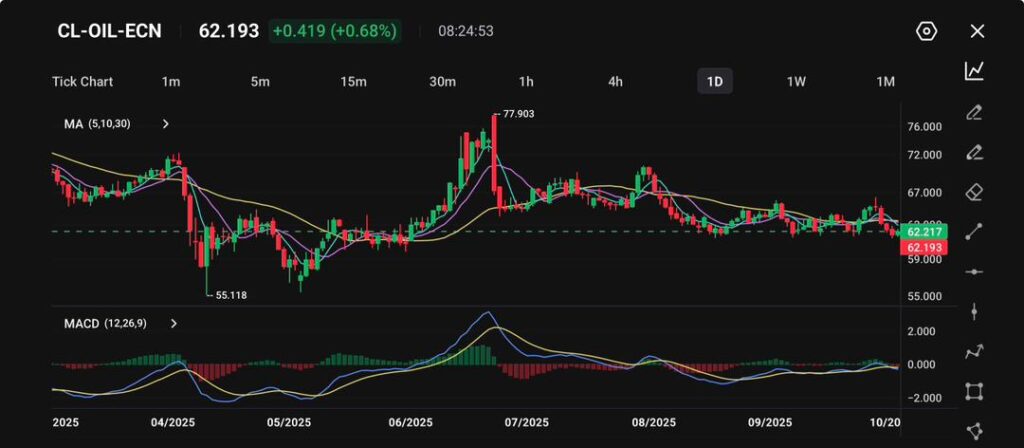 From a technical perspective, oil remains in a consolidation range, with the 5-, 10-, and 30-day moving averages clustered closely, reflecting indecision in the market. Support continues to hold around 59.00–60.00, which has acted as a base since mid-September. Any decisive break below that region would risk a deeper correction toward the 55.00 low from April.