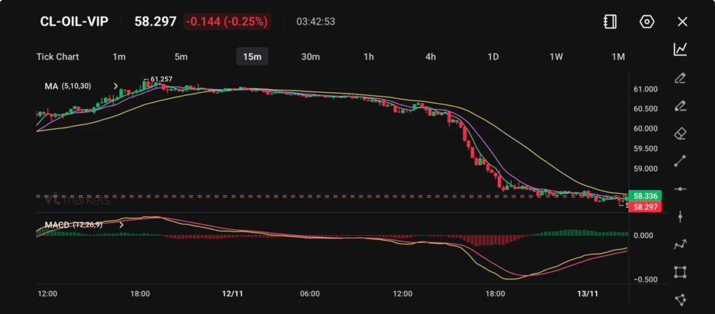 With oil hovering just above key psychological support at $58, any further breach could open the path toward $57.50–$57.00, levels not seen since mid-October.