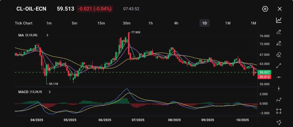 From a technical perspective, oil remains in a downtrend, struggling to recover above key moving averages. The price is trading below the 5-, 10-, and 30-day MAs, signalling strong bearish control.