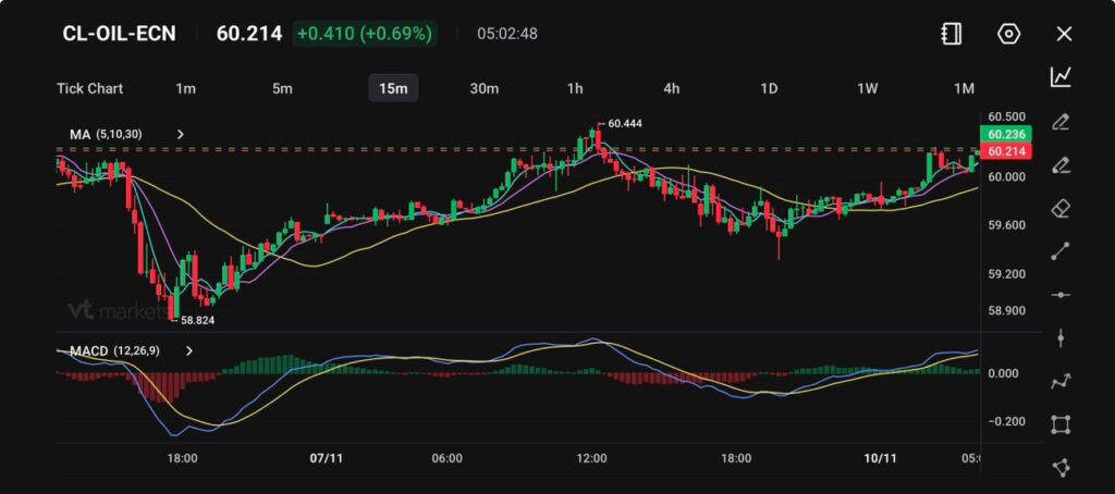 Crude oil prices edged higher toward $60.21, extending their short-term rebound as buyers regained control after defending support near $58.80. The 15-minute chart shows price action forming a gradual uptrend, with moving averages (5, 10, 30) realigning in a bullish crossover and the MACD turning positive.