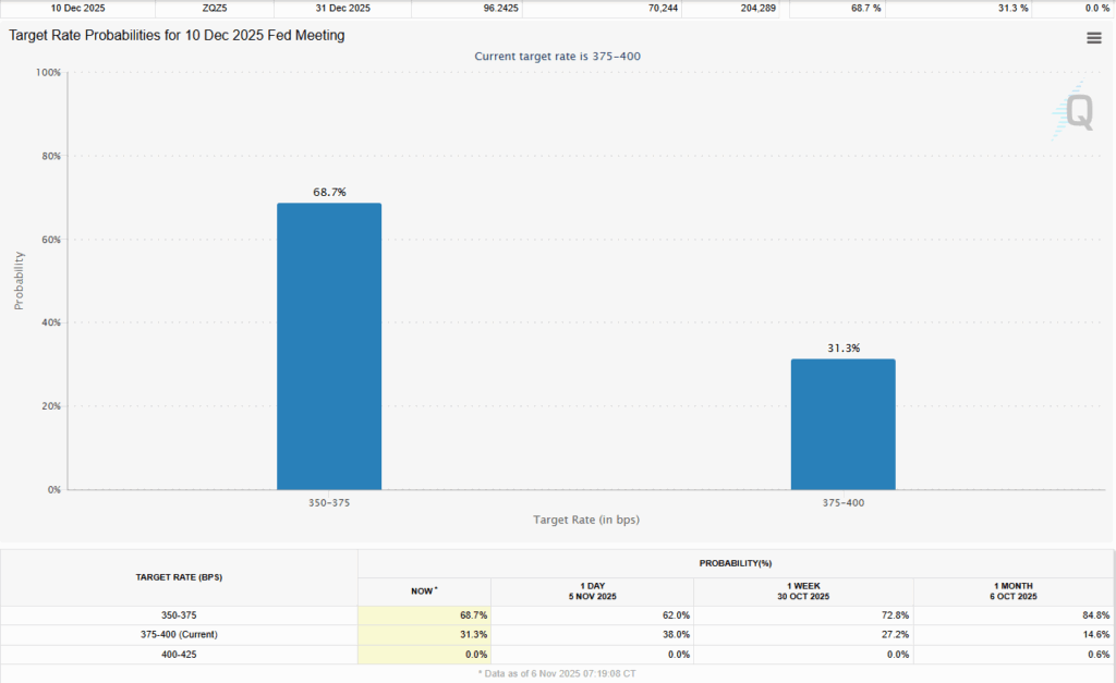Market pricing now implies a near-70% probability of a Fed rate cut at the December 10 meeting, up from 62% just a day earlier, according to the CME FedWatch Tool.