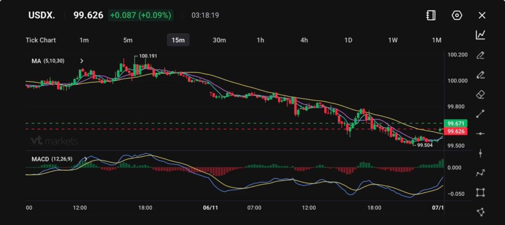 The dollar index currently sits around 99.63, having strengthened slightly but remaining below the psychological 100 mark.