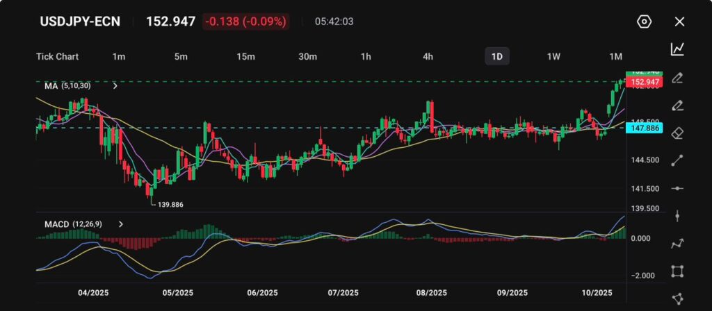 The USD/JPY pair is trading around 152.95, slightly lower by 0.09%, but still hovering near its highest level of the year as the yen weakens under persistent U.S. dollar strength.