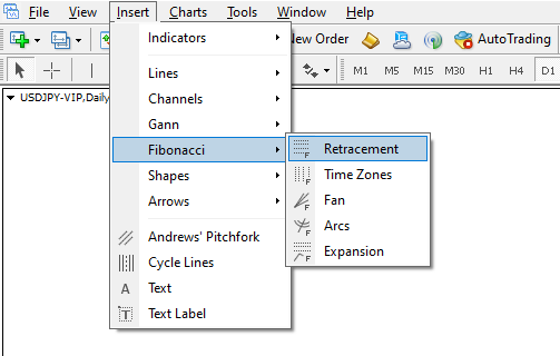 To put it on a chart in MetaTrader, click “Insert” and then “Fibonacci” from the menu. In your trading terminal, you can find the retracement, expansion, fan, arc, and time zone Fibonacci tools. All of these tools use Fibo ratios as their basis.