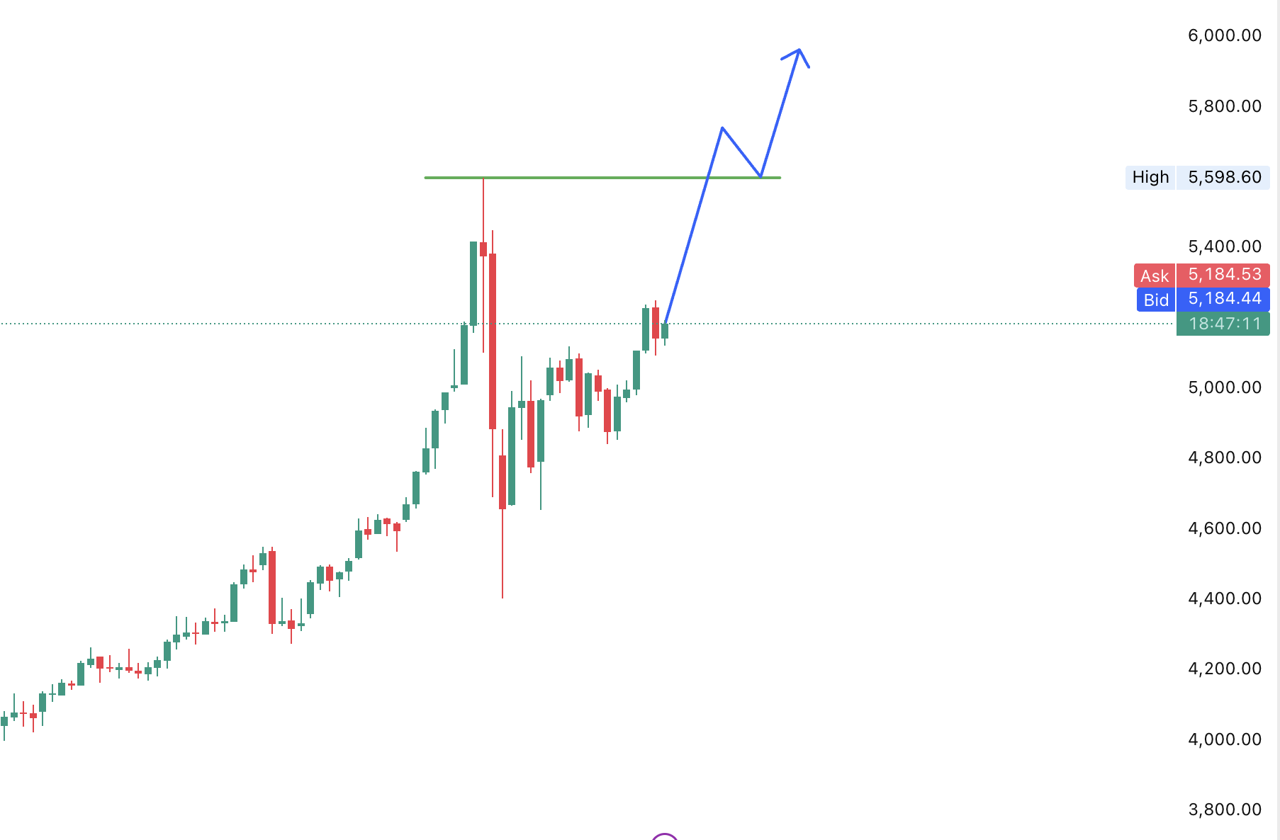 Да, повторный тест 5 600 возможен, если геополитическая напряжённость останется высокой, торговая неопределённость сохранится, а доллар США не будет резко укрепляться. Текущая картина на графике допускает дальнейший рост, если ключевые уровни поддержки удержатся.