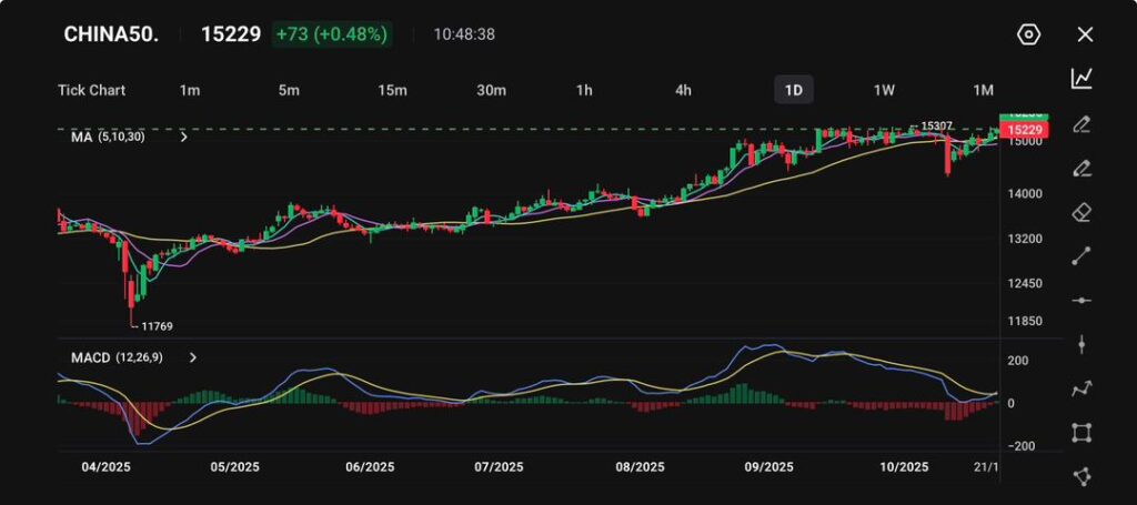 The China A50 Index (CHINA50), which tracks the 50 largest mainland-listed companies, rallied sharply in early October to a multi-year high, reflecting renewed investor optimism before retreating modestly following new tariff threats from Washington.