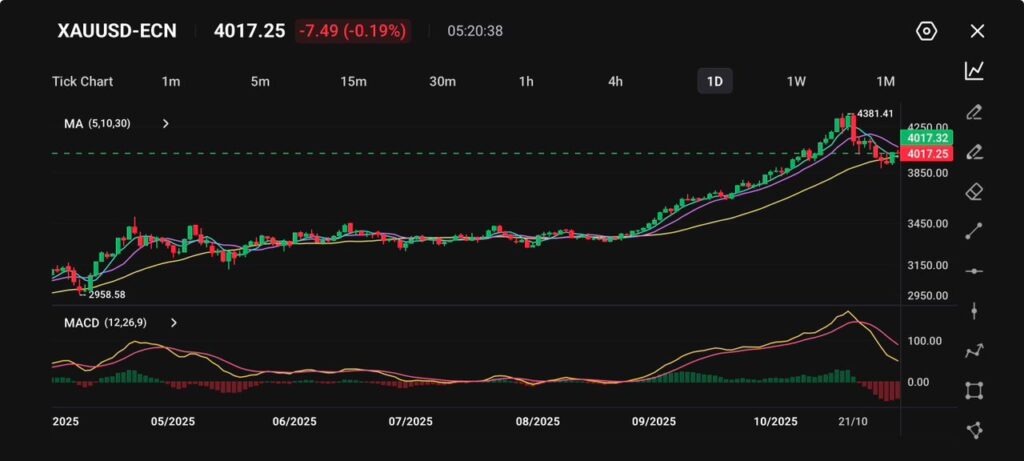 Markets reacted with cautious optimism. The offshore Yuan (USD/CNH) firmed, the Australian dollar nudged higher on improved China sentiment, and Gold remained steady near $4,017 as traders balanced risk-taking with defensive hedging.