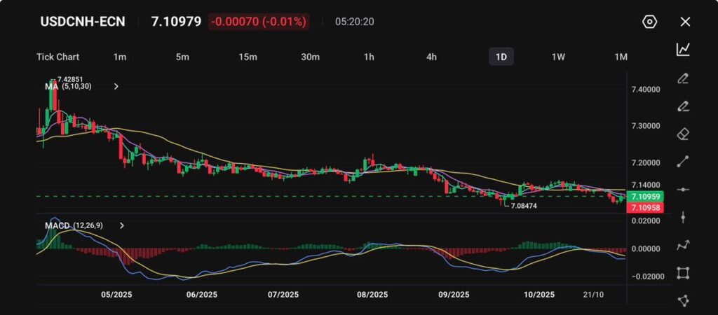The USD/CNH pair held near 7.11, showing muted movement as markets digested the outcome of the recent Trump–Xi meeting, which signalled a cautiously improved tone between Washington and Beijing.