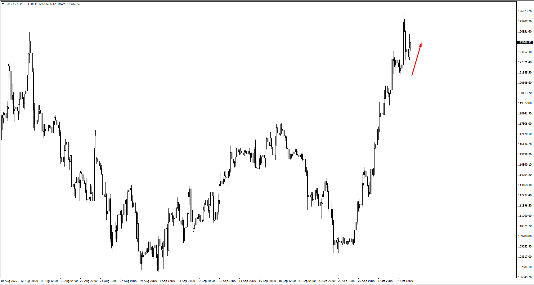 Bitcoin, by contrast, is once again stealing the spotlight. The world’s largest cryptocurrency surged to a new record above USD 125,700 on Sunday, breaking through resistance with strong volume.
