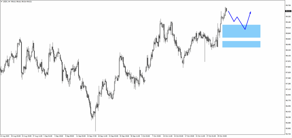 • The US Dollar Index (USDX) rebounded toward the 99.00–100.00 zone, reflecting a defensive bias.