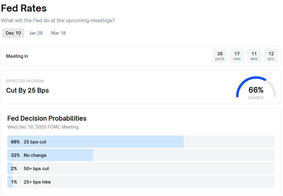 After Powell’s remarks, the mood flipped. The CME FedWatch tool shows cut odds plunging from roughly 90% to 63%, while Polymarket odds echo a 66% probability of a quarter-point cut and 32% chance of no change.
